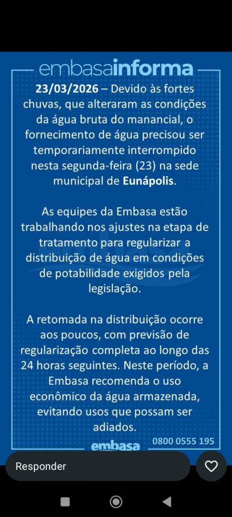 De acordo com a Embasa, a medida foi necessária para garantir que o tratamento da água atenda aos padrões de potabilidade exigidos pela legislação. As equipes técnicas estão atuando nos ajustes do sistema para normalizar o processo.