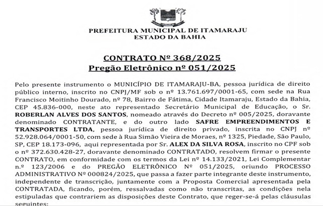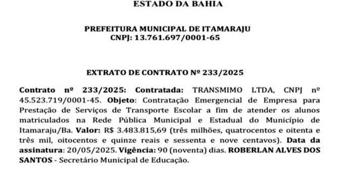 Em Itamaraju, a Transmimo Ltda. (CNPJ nº 45.523.719/0001-45) foi contratada em 20 de maio de 2025 para realizar o transporte escolar da rede pública municipal e estadual. O Contrato nº 233/2025, no valor de R$ 3.483.815,69, foi celebrado de forma emergencial, com validade de 90 dias, sob a justificativa de garantir o início do ano letivo enquanto uma nova licitação não era concluída.