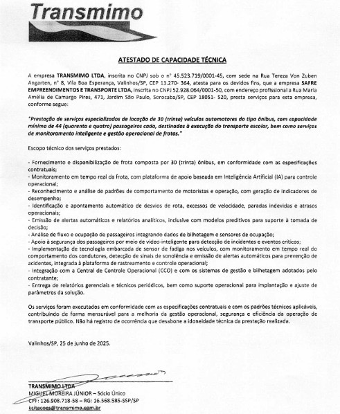 Pouco tempo depois, em Itamaraju, a safre Transportes, criada em novembro de 2023, venceu o Pregão Eletrônico nº 051/2025 para o mesmo tipo de serviço. Um ponto que chamou atenção foi o atestado de capacidade técnica emitido pela própria Transmimo em favor da Safre, declarando que esta possuiria uma frota de 30 veículos, além de sistema de monitoramento e uso de inteligência artificial.