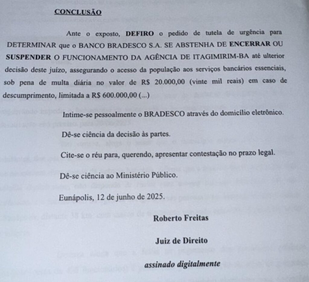 O juiz de Direito Roberto Freitas deferiu, nesta quinta-feira (12), pedido de tutela de urgência para impedir o encerramento ou a suspensão do funcionamento da agência do Bradesco em Itagimirim-BA. A decisão judicial determina que o banco mantenha suas atividades no município até nova deliberação, sob pena de multa diária de R$ 20 mil, limitada a R$ 600 mil, em caso de descumprimento.