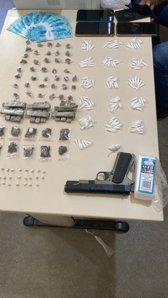 Durante as diligências, foram apreendidos 146 pinos de cocaína, 25 pedras de crack, mais de 180 gramas de maconha, 45 cédulas falsas de R$ 100 (totalizando R$ 4.500), sete aparelhos celulares e um simulacro de arma de fogo.