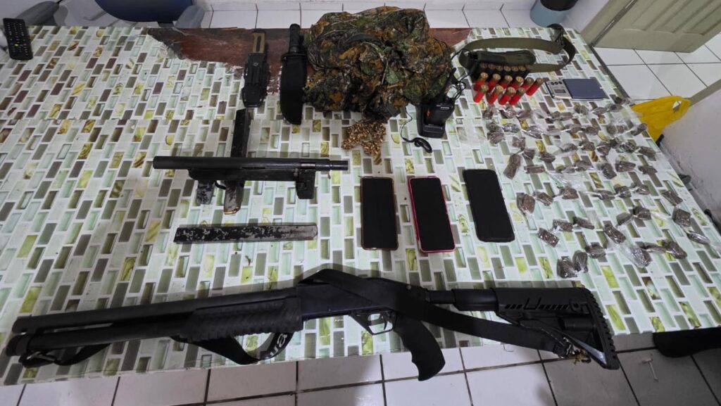 Na ação, foram apreendidos armamentos, drogas e diversos materiais utilizados pelo grupo criminoso, incluindo uma espingarda calibre 12, uma submetralhadora calibre .380, munições, balança de precisão, rádios comunicadores, celulares e porções de maconha.