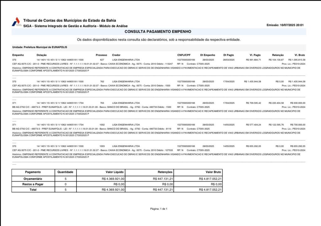 De acordo com informações divulgadas pela Secretaria Municipal de Infraestrutura, sob comando de Jonatha Luis Cavalli, a obra de pavimentação foi contratada por meio do processo licitatório PE010/2024, e formalizada no contrato CT005/2025 com a empresa LIGA ENGENHARIA LTDA (CNPJ 15.270.565/0001-66). O contrato tem valor total de R$ 12.142.153,02, sendo que R$ 4.817.052,21 já foram pagos, o que representa quase 50% do valor contratado.