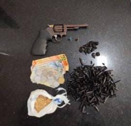 No final da manhã desta quinta-feira (16/10), policiais do 28º Batalhão da Polícia Militar prenderam um homem por posse de arma de fogo e tráfico de drogas no bairro Pequi, em Eunápolis.