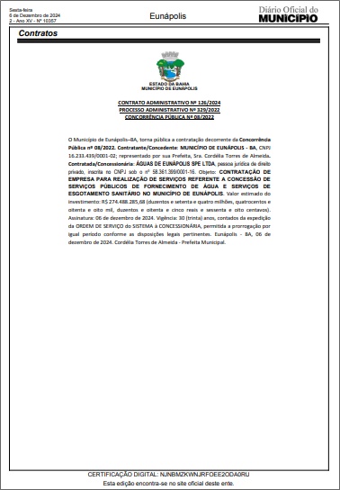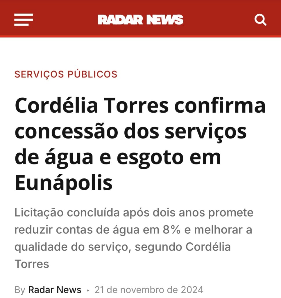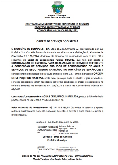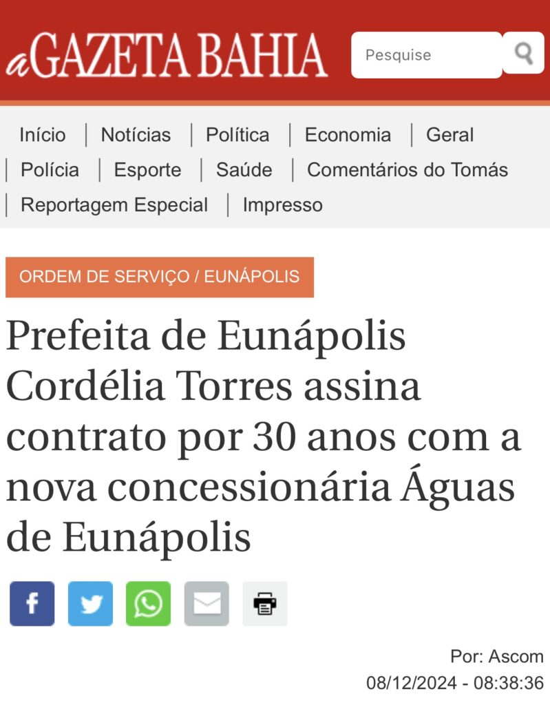 A Concorrência Pública nº 08/2022 foi realizada com transparência, aval do Ministério Público e decisão favorável da Justiça, resultando na assinatura de contrato com a nova concessionária em 2024, ainda na gestão da ex-prefeita Cordélia Torres. O contrato com a empresa Águas de Eunápolis SPE Ltda. prevê investimentos de mais de R$ 500 milhões, redução na tarifa em 8,6% em comparação com a Embasa, indenização de R$ 43 milhões à estatal e universalização do saneamento na cidade em até 30 anos.